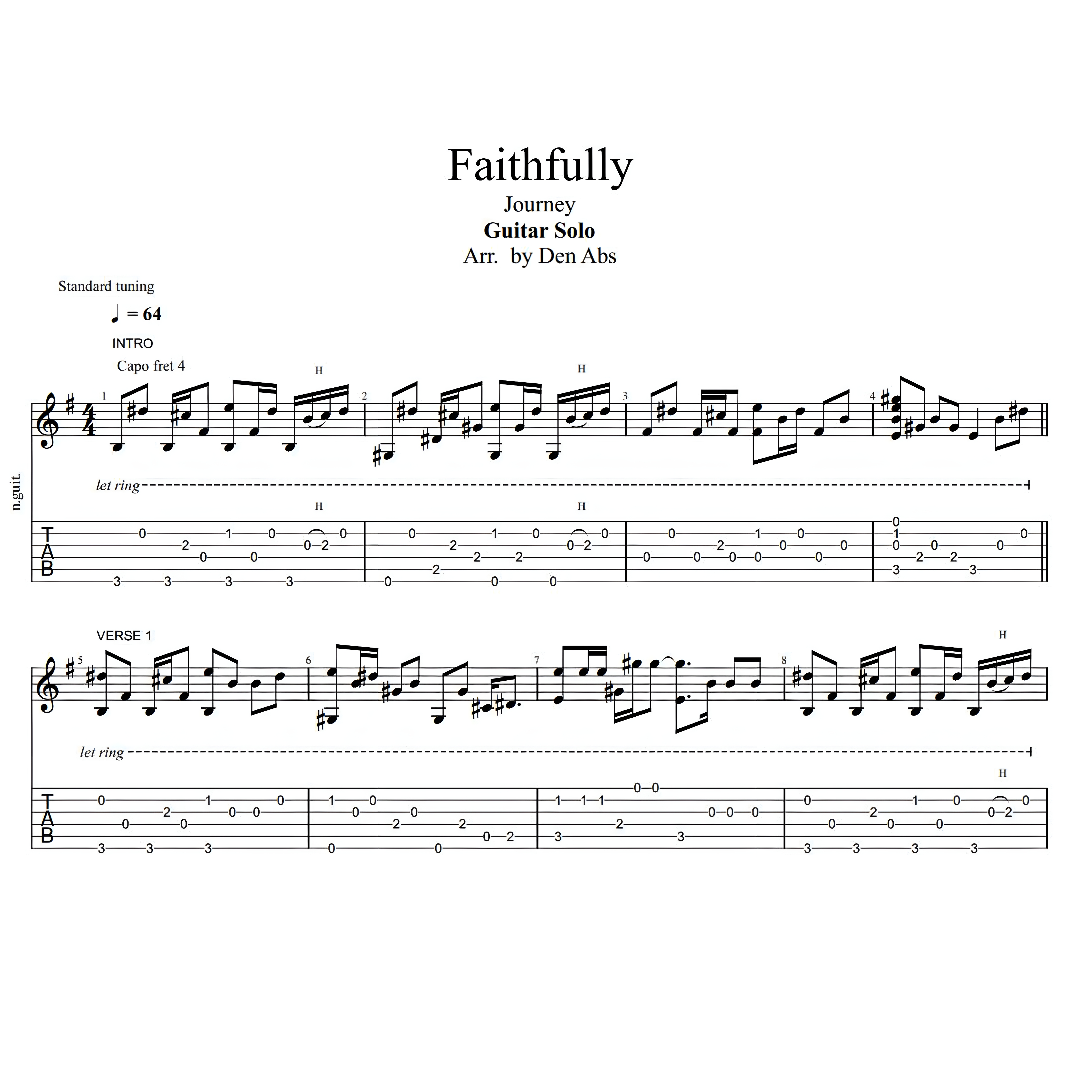 This guitar solo tab is a simplified version of the song FAITHFULLY by Journey but really sounds great. Please watch my Youtube cover first before purchasing the tab. Thanks